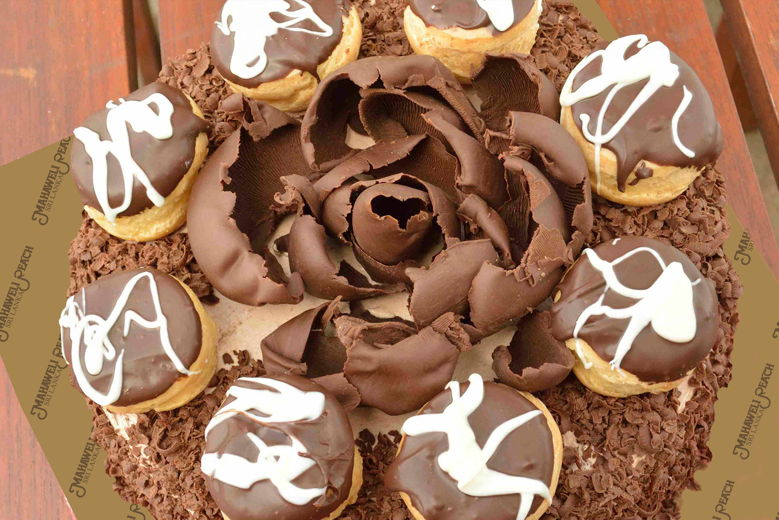 Chocolate Mousse Cake on Top of a Chocolate Nut Fudge, Decorated with Chocolate Ganache & Chocolate Curls.