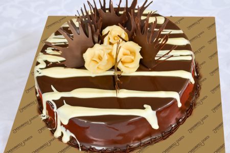 Chocolate Mousse Cake on Top of a Chocolate Nut Fudge, Decorated with Chocolate Ganache & Chocolate Curls.