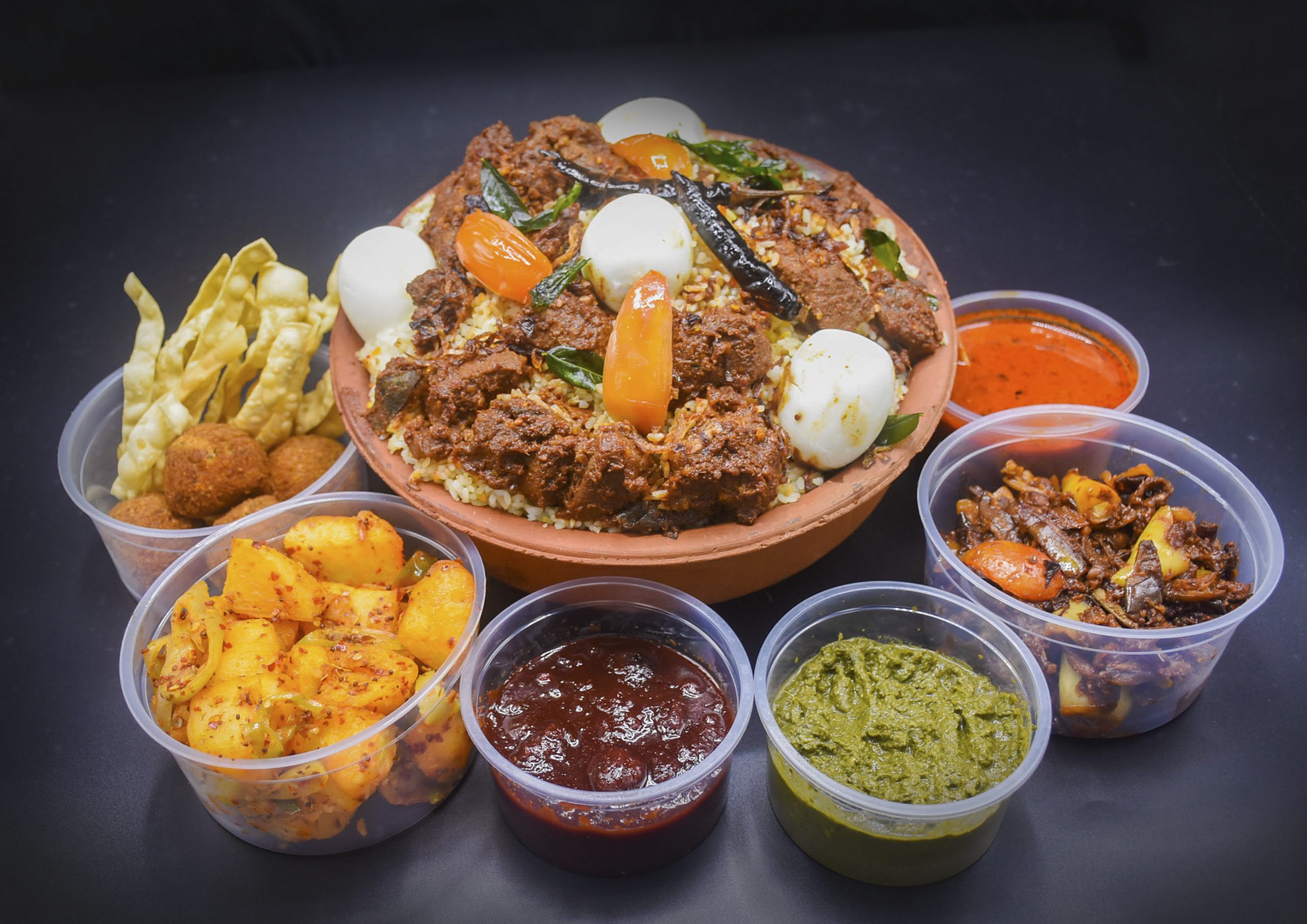 Accompaniments: Beef Curry, Potato Bedum, Brinjal Moju, Fish Frikkadels, Mint Sambol, Gravy, Homemade Chutney and Papadam.