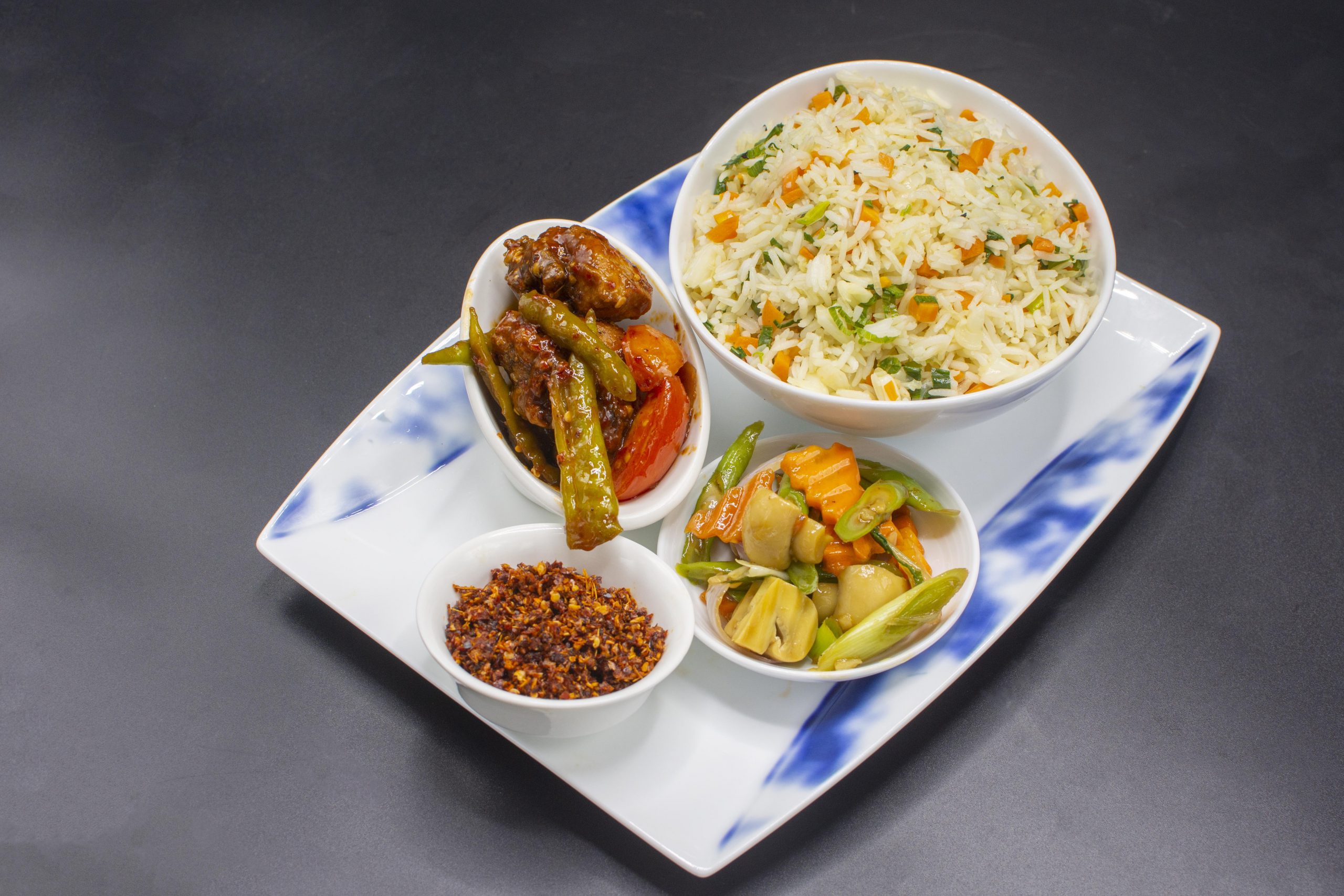 With Devilled Chicken, Vegetable Chop Suey and Chillie Paste
